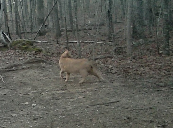 46. Here is an interesting set of 4 photographs contrasting the panther and the bobcat.  These four photographs were taken by the same game cam at the same location a few days apart.  Notice aside from the obvious (the panther has a long tail and the bobcat has virtually no tail), that they are structurally different as well.  The panther is overall larger, more muscular, especially in the front shoulders, than the bobcat.  The bobcat has a more slender profile with his back legs almost appearing longer than his front legs.  Also, the two cats make very different screams.  On the bright side, one would think that we shouldn't have a mouse problem on the mountain!!!