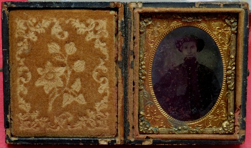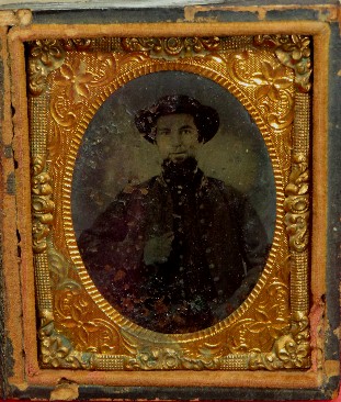 57. Nice little fully cased 1/9th plate tintype of a young Federal Cavalryman.  This is a seated pose, and he is wearing a regulation Federal cavalry shell jacket.  The image is clear, but is unfortunately darker than what we would prefer.  With good lighting, however, everything is easily visible.  Priced at not a lot more than an "empty" Civil War date original case !!--$95.SOLD