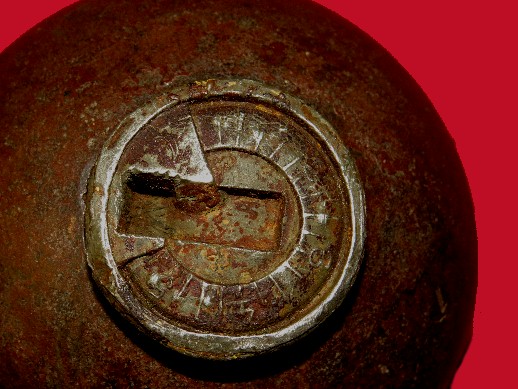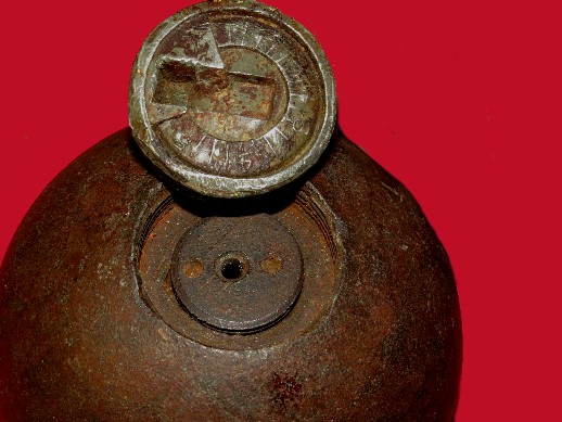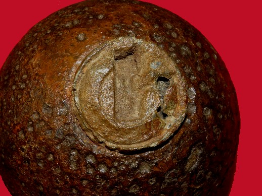 53. Absolutely drop dead beautiful condition NON-EXCAVATED battlefield pick-up 12 lb. Bormann fuzed cannon ball.  This ball was a battlefield pick-up here at Stones River at the time of the battle, and has been in a local family until I purchased it about 40 years ago.  I sold it to my friend, Dave Casper, and that is where it has been until Dave's recent passing.  The underplug will unscrew with just your fingers.  The ball is complete with an excellent condition original Bormann fuse to display with the ball.--$525.
