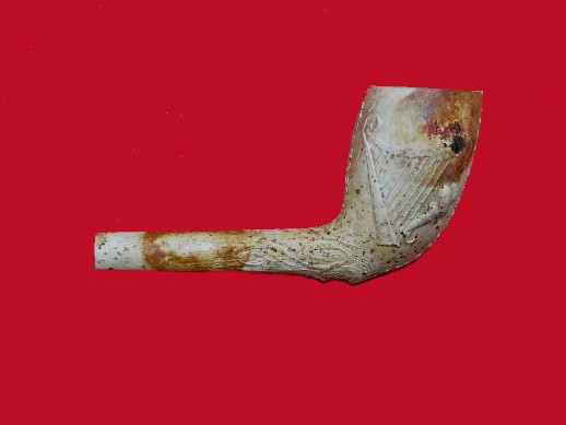 64. Quite rare, "Irish lyre" motif, excavated, glazed clay smoking pipe.  This pipe was recovered from an "Irish Brigade" campsite trash pit and remains in nice condition with about two inches of original stem remaining.  This is one you rarely see.--$125.