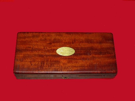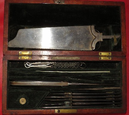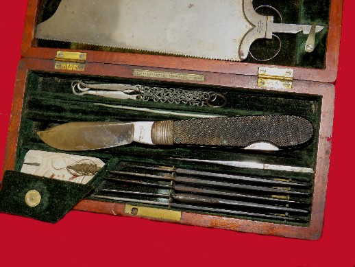 48. Very nice condition, small size Civil War field surgeon's kit.  The kit is 9 3/4 by 9 inches in the open position.  It consists of 12 pieces, including the master bone saw, scissors, flesh stretchers, two large knives, five scalpels, and suture implement for stitching wounds.  In this kit, there is one handle that "quick disconnects" and will fit three separate instruments.  Most instruments are Civil War Era maker marked, "Milikin - 151 Strand - London".  This kit has been in a private museum in Arkansas for the past number of years.  The case itself remains in beautiful condition with an uninscribed oval plaque on the walnut lid.  This medical kit would be a fine addition to any museum or Civil War collection.--$1,650.