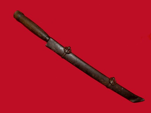 1. Quite wicked, blacksmith crafted, Confederate side knife made by cutting down a Cavalry saber.  The handle is hand-crafted from what appears to be black walnut wood.  The blade is 16 inches and still razor sharp, and the sheath is made from the top portion of the original Cavalry saber scabbard.  This weapon is quite crude but would be 1000% deadly!!!--$450.SOLD*