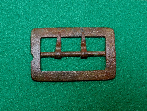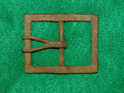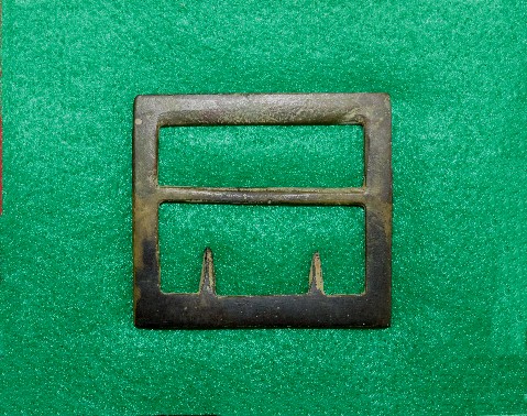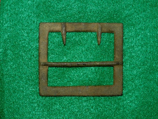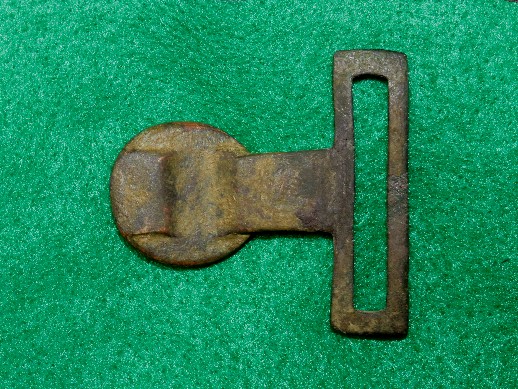 4. Excavated, Federal carbine sling buckle recovered from Camp Stanley, Murfreesboro, Tennessee.  This buckle was found in a trash pit and is a bit pitted in some areas because of that.  It has a uniform brown patina with both attachment tongues remaining intact.--$95.