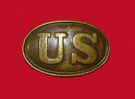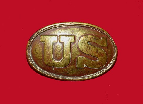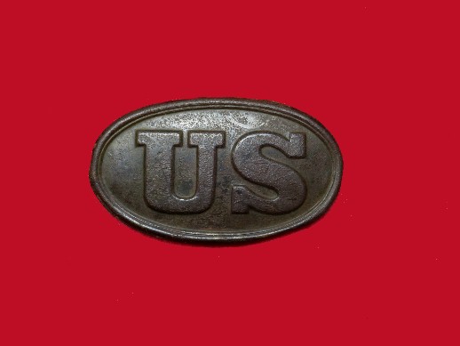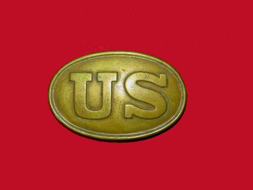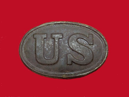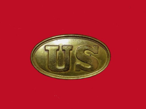 86. Excellent condition, non-excavated, large size, US oval cartridge box plate.  This plate measures 2 1/2 inches between the attachment loops.  If you happen to have a Federal cartridge box needing a cartridge box plate, you won't find one prettier than this one.--$250.