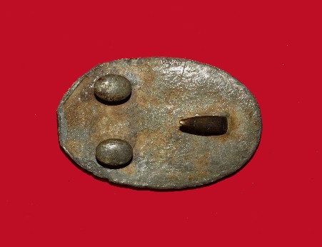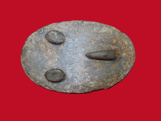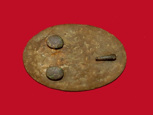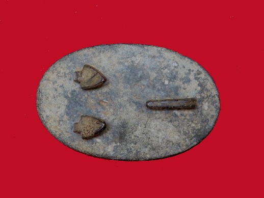 137. Excavated, large size, lead-filled, US oval waist belt plate.  This plate originally had iron capped stud hooks, and the iron caps have decayed away.  This is a very pretty excavated early pattern US oval and was recovered many years ago on private property near Shiloh.--$295.