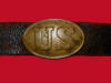 91. Very nice condition, 1850 - 1870 era, Militia or Cadet waist belt rig.  The leather belt remains in nice condition but does have one old break that has been repaired.  The buckle is a cast brass frame style and has a brass tip that covers the end of the leather belt.  This is a very nice looking belt rig that could have seen either CS or US service.--$395.