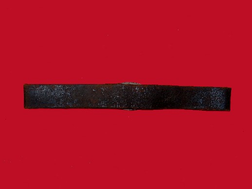 22. Excavated tongue portion of a cast brass, Richmond Arsenal, Enlistedman's two-piece sword belt plate.  This tongue is from a buckle of the pattern of plate "009" in the Mullinax buckle book.  It has a pretty pea-green patina and was no doubt discarded because it has a break in the outside keeper bar.  The break lines up so perfectly that it can hardly even be seen.  This tongue was recovered in a Confederate Cavalry camp near Rippon, West Virginia.  If you happen to have an extra Richmond Arsenal excavated wreath, here is your chance to have a completed two-piece CS sword belt plate.--$950.