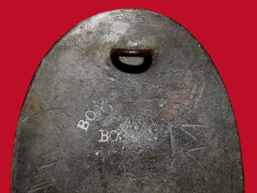 132. Flawless beautiful condition, excavated, large size, lead-filled, US oval cartridge box plate.  This plate was recovered here at Stones River over 40 years ago from the limestone out-croppings on private property on the north side of the battlefield.  The plate has a near reflective, chocolate brown patina with full lead and both iron attachment loops remaining intact.  This plate is literally nice enough to go back on a cartridge box.--$250.