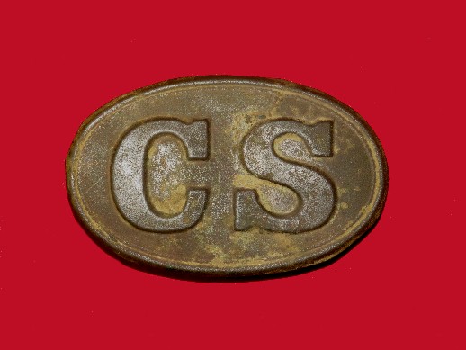 21. Very attractive, excavated, Richmond Arsenal Enlistedman's pattern "CS" two-piece sword belt plate.  This buckle was recovered about 30 years ago from a Confederate Cavalry camp located near Brandy Station, Virginia.  The two pieces were recovered a belt-length apart and fit well with matching patina.  It will be an excellent addition to someone's collection.--$2,250.
