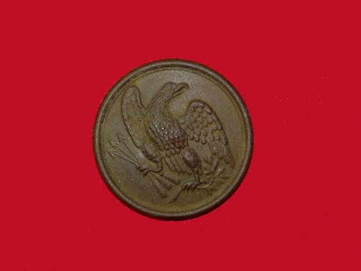 104. Excellent condition, excavated, lead-filled, circular, Federal Eagle breast plate.  This plate was recovered about 40 years ago on private property here at Stones River by Wade Buchanan.  You couldn't ask for a nicer plate with crisp detail on the face, pretty, uncleaned woods patina, full lead, and both attachment loops intact.--$225.SOLD