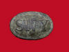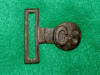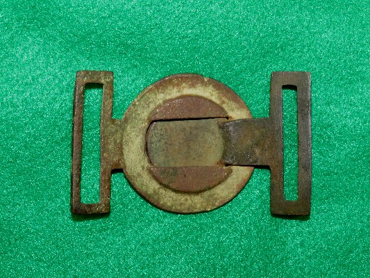 29. Excavated, cast brass, small "Lions Head" Confederate used buckle.  These buckles were imported from England and issued to Confederate forces.  This buckle is "small size" and had only about a 3/4 inch wide belt.  I recovered one of these exact same type buckles in a larger (and wider) "waist belt" size.  The entire buckle had "two" lion's head discs attached with an "s" shaped brass attachment hook.  One end of the hook was open, and actually hooked and unhooked.  The other end was closed, and stayed with that half of the buckle.  It worked much the same as the English snake buckle.  I recovered mine from a Jan. to June - 1863 Army of Tennessee camp along Duck River near Shelbyville, Tenn.  This is a rare style buckle to recover.  I have only seen about a half dozen of these type buckles recovered in all these years.--$150.SOLD