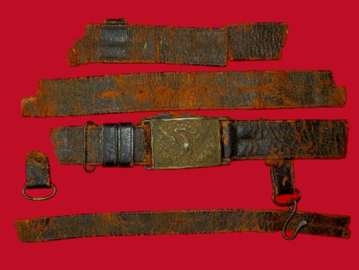 1. Complete Model 1851 Civil War Officer's sword belt rig.  This belt rig came out of a local estate and was quite likely Confederate worn.  The years have taken a toll on the belt and the hangers.  The rig is now broken into several pieces and is displayed in a large display case.  The buckle is an Officer's pattern with solid cast wreaths.  It displays very nicely in the walnut display case.--$450.