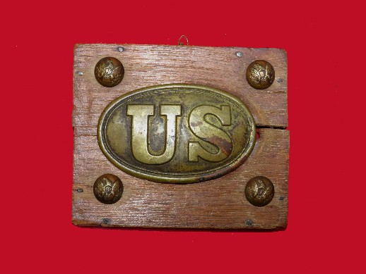 6. Really nice Battlefield relic pick-up artifact display consisting of a perfect condition, large oval, lead-filled, arrow-hook pattern, Union waist belt plate and four Federal Infantry Officer, cuff size buttons displayed on each corner.  This is out of a local estate, and the relics would have been picked up here at the Battle of Stones River.--$395.
