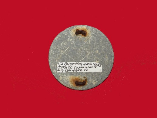 90. Absolutely beautiful condition excavated circular eagle breastplate.  This plate was recovered 50 years ago on private property among the limestone outcroppings here at the Battle of Stones River.  It has a smooth, chocolate patina and doesn't even have all the dirt washed off.  The reverse has full lead, and both iron attachment loops remain intact.  This plate is so nice, you could almost still wear it.--$225.