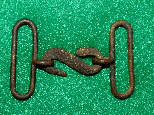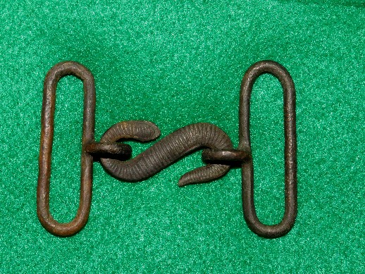 13. Nice condition excavated small size 3-part Confederate used English snake buckle.  This one was recovered about 30 years ago from a Confederate Cavalry picket camp located at the base of Lee's Knob on Hwy. 231 South between Murfreesboro and Shelbyville, TN.  It was recovered by Doug Drake.--$475.SOLD