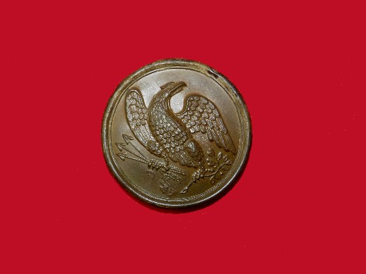 43. Super nice, excavated, circular, lead-filled, Federal Eagle breast plate.  This was recovered on private property among the limestone out-croppings here at Stones River.  It has a chocolate brown patina, full lead, and both iron attachment hooks remain intact.  You could easily put this one back on the cross belt and wear it.--$250.