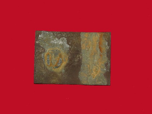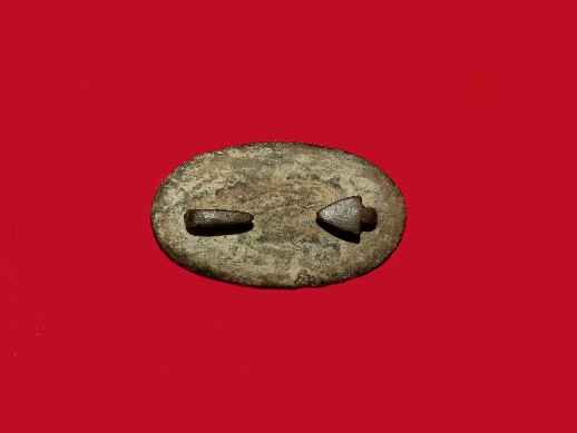117. Beautiful condition, excavated, lead-filled, large size US oval cartridge box plate.  This plate was recovered many, many years ago on private property here at the Battle of Stones River.  You couldn't ask for a more beautiful excavated cartridge box plate.  The face has a near reflective brown/green patina, and the reverse has full lead with both iron loops remaining perfectly intact.  This is a beauty!!!--$250.