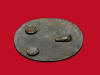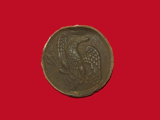 107. Excellent condition, excavated, circular Eagle breast plate.  This plate was recovered on private property here at Stones River over 40 years ago.  It has a smooth chocolate patina, full lead, and one of the two attachment loops remaining intact.--$195.
