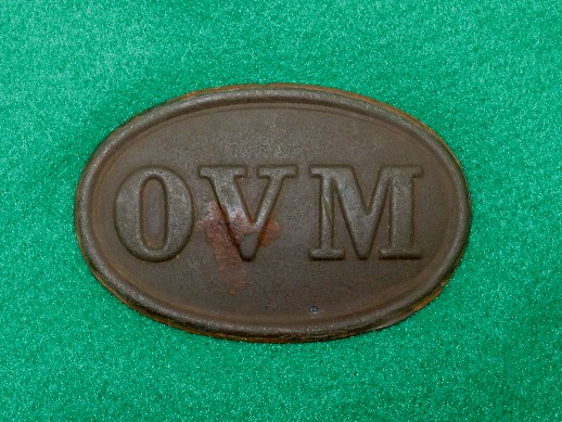 17. Absolutely beautiful face on this excavated, large size, lead-filled, "OVM" (Ohio Volunteer Militia) cartridge box plate.  This cartridge box plate was recovered about 40 years ago from an Ohio Infantry camp located near Decherd, Tennessee.  I actually dug a matching OVM buckle to this box plate about 50 feet away.  This will be a centerpiece to someone's Ohio display.--$2,450.