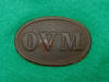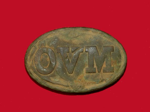 21. Really pretty excavated lead filled, medium size "OVM" (Ohio Volunteer Militia).  This pretty buckle was recovered by Doug Drake almost within sight of the shop here.  (North side of Asbury Lane)--$2,250.SOLD