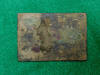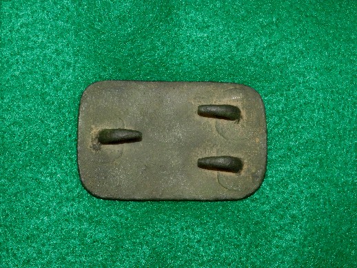23. Excavated, stamped brass, plain face, rectangular, Confederate waist belt plate.  These are recovered from early war Confederate sites.  It is quite rare to recover one of these with most of the iron frog hooks still intact on the reverse.  My very first Confederate plate to recover back in 1969 was a plain face rectangle just like this one.  I recovered it from a Confederate camp site near Chickamauga, Georgia.  This is a really nice example.--$375.