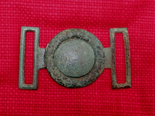 8. Excavated, cast brass, small "Lions Head" Confederate used buckle.  These buckles were imported from England and issued to Confederate forces.  This buckle is "small size" and had only about a 3/4 inch wide belt.  I recovered one of these exact same type buckles in a larger (and wider) "waist belt" size.  The entire buckle had "two" lion's head discs attached with an "s" shaped brass attachment hook.  One end of the hook was open, and actually hooked and unhooked.  The other end was closed, and stayed with that half of the buckle.  It worked much the same as the English snake buckle.  I recovered mine from a Jan. to June - 1863 Army of Tennessee camp along Duck River near Shelbyville, Tenn.  This is a rare style buckle to recover.  I have only seen about a half dozen of these type buckles recovered in all these years.--$150.SOLD