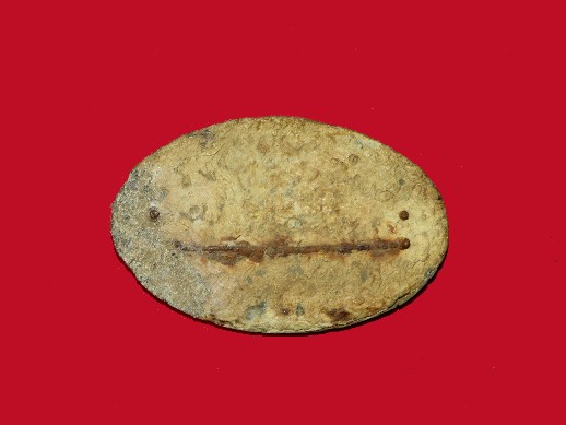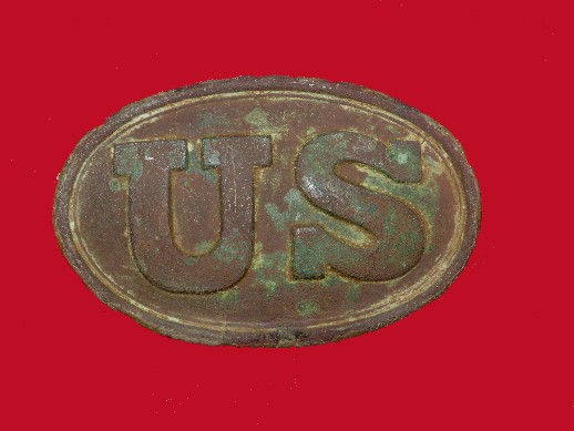 124. Excellent condition, excavated, large size, US oval cartridge box plate.  This plate was recovered here at Stones River about 40 years ago and has never even been washed off.  The face has a smooth, brown/green patina, and the reverse has full lead and both attachment loops intact.--$250.