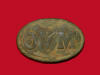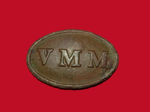141. Beautiful excavated large size oval "VMM" (Volunteer Maine Militia) cartridge boxplate.  This plate was recovered about 40 years ago on private property near Port Hudson, LA.  The face has a slick chocolate brown patina and sharp, crisp letters and the plate has literally never even been rinsed off.  The plate is the pattern ""VMM" with very little lead in the back - Actually just barely enough to keep the wire loops in place.  Rusty residue of the wire loops still remains.  This is one of the prettiest "VMM"s from that area that I have seen.--$1,150.