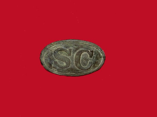 19. Extremely rare, large size, lead-filled, "SC" (South Carolina) waist belt plate.  This buckle was recovered many years ago from a South Carolina Militia camp located near Charleston.  The buckle has a smooth chocolate patina with crisp detail and full lead in the reverse.  It would be very difficult to find a prettier South Carolina oval than this one.--$5,850.SOLD