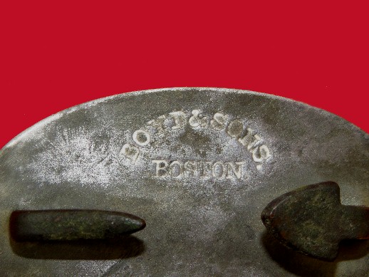 14. Very pretty condition, non-excavated, large size, lead-filled, US oval cartridge box plate.  The plate has full lead, both attachment loops 100% intact, and a "Boyd & Son's - Boston" backmark.  The plate has a pleasing, aging patina with early "block letter" style US.  This was a local hand-me-down plate brought into the shop.--$395.