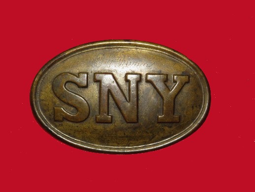88. Absolutely beautiful condition, large oval, lead-filled, "SNY" (State of New York) 1840 - 1850 era, puppy-paw hook waist belt plate on the original brown buff Civil War waist belt.  This one appears to be unissued and is in super nice condition.  This would be a fine centerpiece to someone's New York collection.--$1,150.