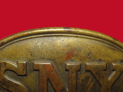 8. Absolutely pristine beautiful condition, non-excavated, large size, lead-filled "SNY" (State of New York) cartridge box plate.  This beautiful plate came out of a central New York estate about 45 years ago.  The soldier's name (D. E. Dunn) is cut with a pen knife into the face of the plate.  The name's patina is consistent with the rest of the plate and is no doubt Civil War Era.  We attempted to locate him, but there seemed to be unending choices.  The plate has a rich, aged patina, full lead, and both attachment loops intact.--$975.