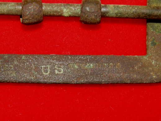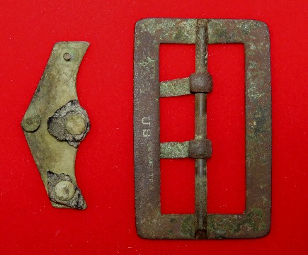 13. Quite rare excavated "US and Maker Marked" Federal carbine sling buckle, and matching cast brass belt tip.  The buckle is boldly marked "US" and "T. G. Sheppard", and the belt tip still has some leather on the reverse.  It was recovered many years ago from "Camp Stanley" here at Murfreesboro, TN.  It is very rare that one of these nicely marked is recovered anymore.--$350.