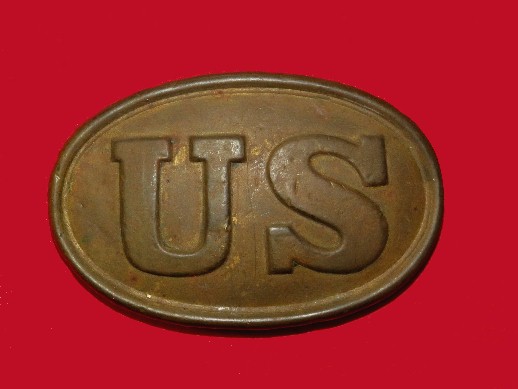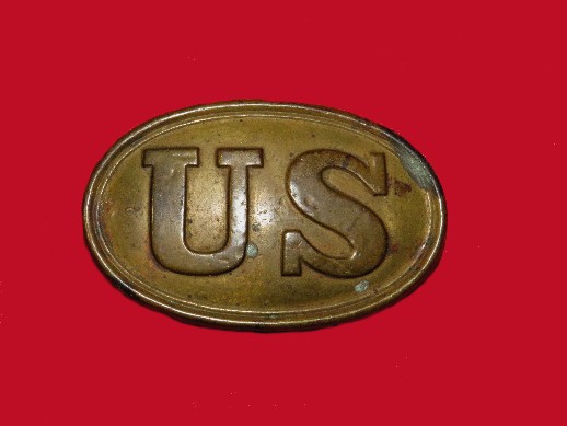 97. Excellent condition, non-excavated, large size, US oval cartridge box plate.  This plate measures 2 1/2 inches between the attachment loops.  If you happen to have a Federal cartridge box needing a cartridge box plate, you won't find one prettier than this one.--$250.