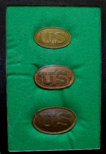 1. Absolutely beautiful set of three Federal US waist belt plates.  These three plates represent the three different sizes that US plates may be found in.  The top plate is a Model 1839, non-excavated "baby oval" US waist belt plate with full lead and single arrow attaching hook.  The second plate is the ultra-rare "true medium size", lead-filled, US oval with puppy-paw hooks waist belt plate.  This plate has only been recovered in a few locations.  This example was recovered at Harrison Landing, Virginia, in 1991.  And the third plate is a standard early war large size US oval with puppy-paw hooks and full lead.  This buckle was recovered here at Stones River about 40 years ago.  It is very, very rare to see this set of US buckles in excellent condition offered together.--$1,450 for the entire set.