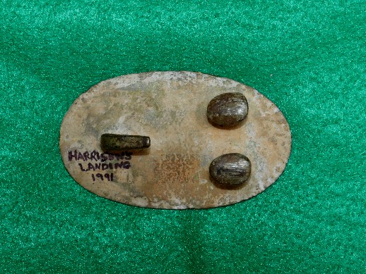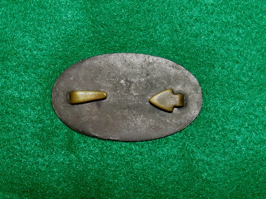 128. Beautiful condition, excavated, lead-filled, large size US oval cartridge box plate.  This plate was recovered many, many years ago on private property here at the Battle of Stones River.  You couldn't ask for a more beautiful excavated cartridge box plate.  The face has a near reflective brown/green patina, and the reverse has full lead with both iron loops remaining perfectly intact.  This is a beauty!!!--$250.