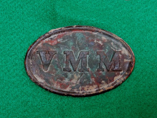 151. Beautiful excavated large size oval "VMM" (Volunteer Maine Militia) cartridge boxplate.  This plate was recovered about 40 years ago on private property near Port Hudson, LA.  The face has a slick chocolate brown patina and sharp, crisp letters and the plate has literally never even been rinsed off.  The plate is the pattern ""VMM" with very little lead in the back - Actually just barely enough to keep the wire loops in place.  Rusty residue of the wire loops still remains.  This is one of the prettiest "VMM"s from that area that I have seen.--$1,150.