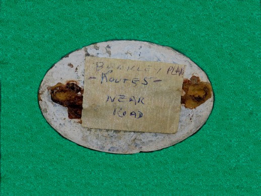 12. Excavated, "C" and a portion of the "S" of an extremely rare "rope border" style CS oval waist belt plate.  This approximately one half of the entire buckle, but it is the "good half" with the "C" on it.  This was recovered from General Bragg's Confederate camp located near Bardstown, Kentucky.  This was part of the "Battle of Perryville" campaign.  This display nearly has the eye-appeal of an entire Confederate CS buckle and at 10% of the price.--$395.SOLD