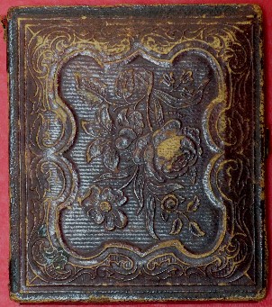 140.  Quite rare hanging style ornate gutta-percha case for a 1/6th plate tintype or ambrotype.  It is an "Improved UNION CASE" with an "1859" patent date.  When this case came out of the estate sale some of the corners were chipped, and I have had them professionally restored.  Perfect for your "extra nice image.--$150.