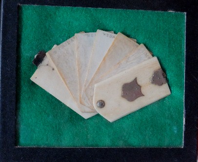 11. Quite rare to find, soldier's folding, portable, ivory diary.  These little diaries were carried by soldiers on the march so that they could make entries to transfer to their regular paper book diary back at camp once they returned from the field.  This example remains in excellent condition with a silver Patriotic Shield on the outside.  You wrote in this diary in pencil and simply wiped it off to be ready for its next use.  Many Officers carried these.  There is faint evidence of some writing on the shield, but it is worn away.--$95.SOLD*