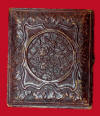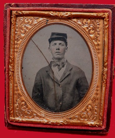 196. Fully cased, 1/6th plate tintype of what I believe to be a north Georgia Confederate.  The image is out of the Ringgold, Georgia, area and pictures a seated soldier wearing what appears to be a butternut colored uniform.  His belt rig is clearly visible with a pair of Smith & Wesson revolvers stuck behind it.  The buckle is clearly visible and is clearly a large oval.  It has been partly gilted by the photographer.  I believe, however, I can faintly see the remnants of "CS" behind the gilting.  I cannot say for 100% sure though.  The case is quite unusual as well with a patterned backing behind the image.  Too bad I cannot say for certain that the buckle says "CS", but I personally believe it does.  We are pricing this image at a level you would expect a nice armed Union image to be.  But, every time I pick it up, I hear "Dixie" playing.--$850.