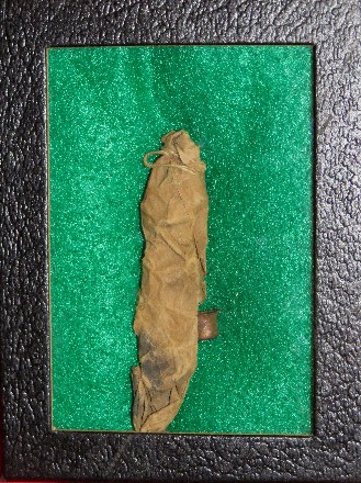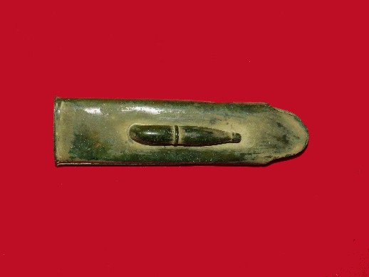 175. Extremely uncommon to excavate, this is a camp site dug, small brass book for holding "gem size" tintypes.  The pages will still open and close.  The last two photographs are of a non-excavated similar folding book with gem size Civil War tintypes still inside.  It is listed as number 1 in the Images section.  These two items would make a fantastic display together.  For the excavated folding image book "alone"--$48.  Or, for both books, including tintypes and in a glass display case--$195.