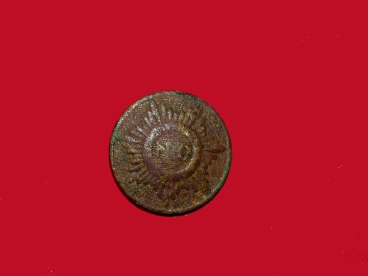 68. Very pretty condition, excavated, North Carolina Sunburst coat size uniform button.  The VERY UNUSUAL thing about this button is that it has the original soldered on shank still intact.  It was recovered by one of my early hunting friends, Frank Giles, from a Confederate camp near Dalton, Georgia.  We probably together recovered 40 - 50 of these, and no more than 4 or 5 had the shank intact.--$195.