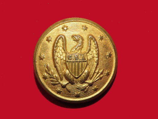 210. Super, Super rare, non-excavated, CS26B, coat size Confederate Staff Officer button.  This is a Confederate local with 100% gilt front and back with shank intact.  To give you an idea how rare this button is in a non-dug state, in 50 years, I could count on my fingers how many of these I have had.  Interestingly, here in the Western Theater spring of 1863, Army of Tennessee Confederate winter camps, I have excavated probably 30 or 40.  Finding one NON-EXCAVATED is a whole different story.--$1,250.