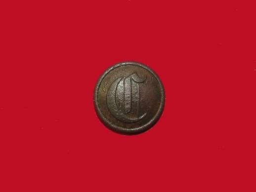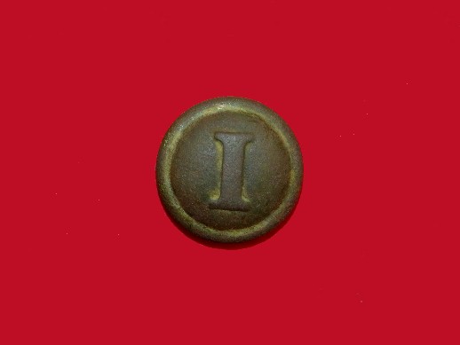 54. Absolutely beautiful condition, excavated, solid cast "I" from the Battle of Franklin, Tennessee.  This button was recovered from a lawn on the east side of Columbia Pike only a few hundred yards from the Carter House.  It has never even been washed off.--$175.