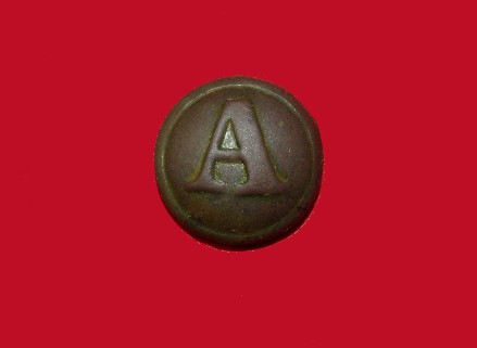69. Absolutely smoking nice, excavated, Confederate block "A" (Artillery) coat size uniform button.  This button was recovered from the 1863 Confederate Artillery camp located on Lewisburg Pike just outside Shelbyville.  I have very fond memories of this camp in that I dug five Confederate buckles there.--$175.