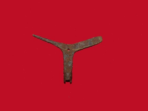 64. Absolutely beautiful condition, excavated, very rare 1840 era NCO breast plate with three iron hooks that was actually a functional belt buckle.  You rarely ever see one of these plates recovered that has an excellent face, full lead, and all three hooks intact.  This one does.--$350.