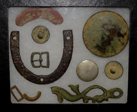 76. Very nice display of excavated artifacts recovered from the camp of the 1st Alabama Cavalry CSA.  The artifacts consist of a bridle rosette, an iron Cavalry boot heel plate, a boot toe plate, a brass spur buckle, and three plain face gilted uniform buttons.  This display is presented in a 5" x 6" glass Riker case.  There are nine artifacts in total.--$58.