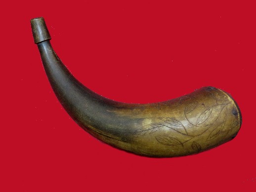 65. Very Pretty hand crafted 13 inch powder horn that has the owner's initials "W.A." along with an intricate vine and leaves nicely carved into the horn.  This is the exact type horn - along with the family fowling rifle - that many young Confederates left home for the Civil War carrying.--$195.SOLD