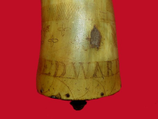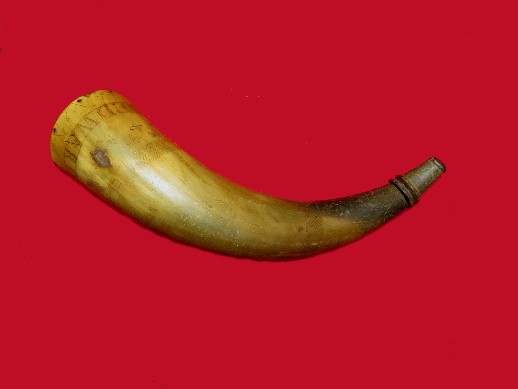 52. Excellent condition, 13 inch, hand crafted, 1840 - 1860's era powder horn.  This horn has the name, "Edward Tainter" beautifully inscribed into it.  This is very likely a Civil War Confederate soldier or his father.  Many young Confederates left home carrying the family fowling rifle and powder horn.  HOLY COW - I JUST NOW SAW THE CONFEDERATE BATTLE FLAG IN THE THIRD PICTURE !!!--$250.